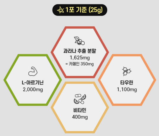 주요 성분과 효능을 보자면 카페인은 과라나 추출분말 1,652mg에서 얻은 순수카페인입니다. 그리고 장어, 굴에 많이 함유되어 있는 L-아르기닌은 체내에 꼭 필요한 아미노산으로 2,000mg 함유되어 있습니다.