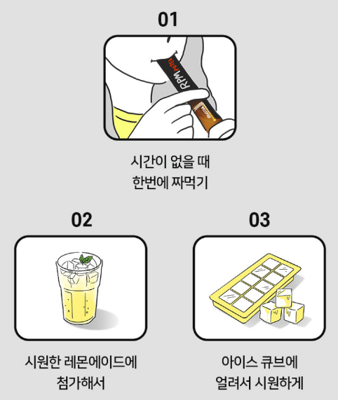 알피엠포텐은 액상형 포 형태로 바로 짜서 먹을 수 있도록 간편하고 휴대하기 좋습니다. 포 형태로 바로 먹어도 되고 시원한 물 및 탄산수와 함께 희석하여 드셔도 됩니다.